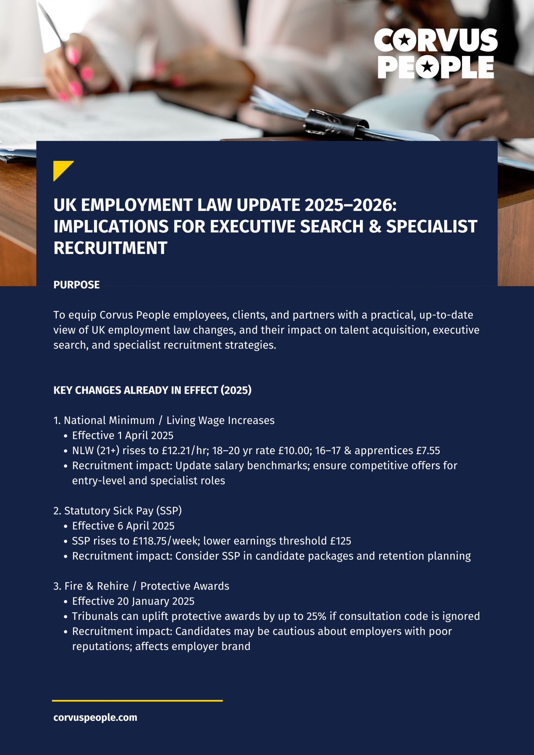 To equip Corvus People employees, clients, and partners with a practical, up-to-date view of UK employment law changes, and their impact on talent acquisition, executive search, and specialist recruitment strategies.